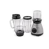 Whether setting up house for the first time or looking to add versatility to an already busy kitchen, this 11-piece mixing system provides exceptional convenience. The set includes a powerful 350-watt motor base, one chopping blade base, one ice-crushing blade base, two 24-ounce heavy-duty plastic travel mugs, 12-ounce and 18-ounce plastic blending containers, two leak-proof closable sipping lids, and two comfort-fit drinking rims. With its small footprint, the compact unit takes up minimal space on the counter, yet it replaces a food processor, blender, and coffee grinder. Use it to grind fresh coffee beans or to make homemade salsa, salad dressings, milk shakes, and more. Simply add ingredients to one of the two blending containers, connect the container to the power base, and turn the dial from "low" to "high" speed or to the "pulse" setting to set the blades spinning. Even more, the containers feature durable see-through construction, which makes it easy to keep an eye on the consistency and to identify contents at a glance when stored in the refrigerator. A user manual with recipes comes included. Quick to assemble and easy to clean, the mixing system, with its sleek brushed-chrome exterior, measures approximately 6 by 5-1/2 by 13-1/5 inches and carries a one-year limited warranty.
