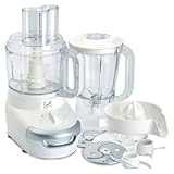 Equipped with 550 watts of power, this multi-purpose machine functions as a food-processor, blender, and juicer thanks to three separate attachments that all fit onto one motor base. Make hors d'oeuvres one minute then blend up margaritas for friends the next--simply twist and turn to remove the bowl, then pop on the blending jar. Or connect the direct-drive citrus press to serve fresh-squeezed orange juice right into a glass. The three-in-one appliance chops, slices, shreds, mixes, blends, juices, emulsifies, and even makes dough. Its polycarbonate food-processor bowl offers a generous 12-cup capacity and a lid that comes with a dual-feed tube for accommodating both small- and large-size foods. Accessories include a durable stainless-steel chopping/mixing blade, stainless-steel slicing and shredding discs for fine and coarse options, a dough hook that kneads dough to perfection, and an emulsifying disc that quickly whips cream and eggs. The 40-ounce polycarbonate blender jar provides an easy-grip handle and a secure-fitting lid. Set the blending speed to low or high, or choose pulse for exceptional control. Other highlights include a built-in storage drawer for keeping accessories easily accessible, cord storage for tidy countertops, and dishwasher-safe parts for quick cleanup. A spatula and seven Emeril recipes are also included. The food processor measures 23 by 15-1/2 by 20-1/2 inches and carries a one-year limited warranty.
