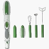 This 5 in 1 Rechargeable Kitchen Wand comes with peeler, frother, whisk, brush, and soup blender attachments. The Peeler attachment is ideal for peeling carrots, potatoes, and zucchini. Perfect for scaling fish without any mess! The Frother attachment is perfect for making milk froth for your morning coffee, and is ideal for making milkshakes. The Whisk attachment beats whole eggs, frosting, light mixtures, and is great for creating smooth batters. The Brush attachment is excellent for cleaning fruits and vegetables.The Soup Blender Attachment is ideal for mixing liquids and soups - turn your rustic chowder into a smooth puree. The machine is waterproof. Assembly level/degree of difficulty: Easy.